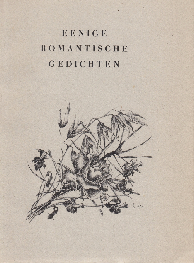 28. [NIJHOFF (vert.), M.] Eenige romantische gedichten. Naar het Fransch. (Met vijf originele lithos van Titia Wiegman). Amsterdam, (Vijf Ponden Pers), 1944. Ingenaaid met stofomslag. Niet afgesneden. 16 p. Gedrukt in blauw en zwart in een oplage van 55 exemplaren. Niet opengesneden. 1e druk. Zeer gaaf.