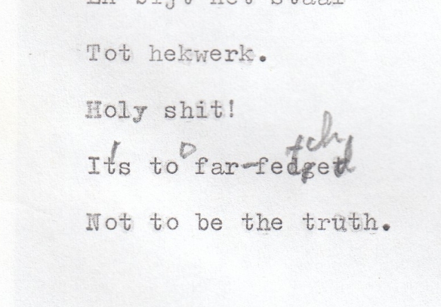 39. WOLKERS, Jan Manhattan. (Gedicht) Typoscript. 29,5 x 21 cm. Alleen recto. Met potloodcorrecties in de zevende (‘Zakken’ werd ‘Zinken’) en de eennalaatste regel.
