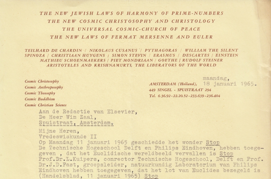 * Het Euclidische wereldbeeld is vervallen, aldus de beroemde Amsterdamse restaurateur van d’Vijff Vlieghen, de kok en proto-provo Nicolaas Kroese (1905-1971), die zich voordeed als grote wetenschapper. De onopgeloste vraagstukken der wiskunde konden worden opgelost, dus de overdruk van de 31 mito-genetische stralingsvelden kunnen geneutraliseerd worden. Het bestaande wetenschappelijke wereldbeeld heeft zijn geldigheid verloren.