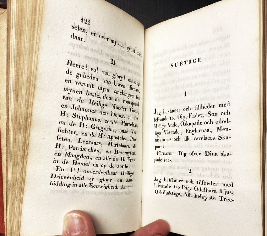 * Vrome theologische tekst vertaald in 24 talen, vaak met het eigen schrift: onder andere in het Georgisch (‘Iberice’) en Ethiopisch (beide op de middelste foto), Engels, Armeens, Arabisch, Iers, Grieks, Duits, Frans, Chaldeeuws, Nederlands, Neo-Aramees, Spaans, Hongaars, Illyrisch, Perzisch, Pools, Chinees, Zweeds en Turks. Dit boek is een product van de Armeense diaspora. Het eilandje San Lazzaro in de lagune van Venetië herbergt nog altijd een omvangrijk Armeens klooster met een museale bibliotheek en de drukkerij waar dit boek 188 jaar geleden gedrukt werd.