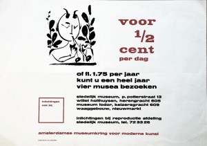 30. (PICASSO, Pablo) voor 1/2 cent per dag of fl. 1.75 per jaar kunt u een heel jaar vier musea bezoeken Amsterdam, amsterdamse museumkring voor moderne kunst, ca. 1960. Liggend formaat 42 x 59 cm. Gedrukt in rood en zwart met afbeelding van een musicerende faun van Picasso (uit 1948). Het typografisch ontwerp is mogelijk van Sandberg. Tweemaal gevouwen, verder gaaf en fraai.