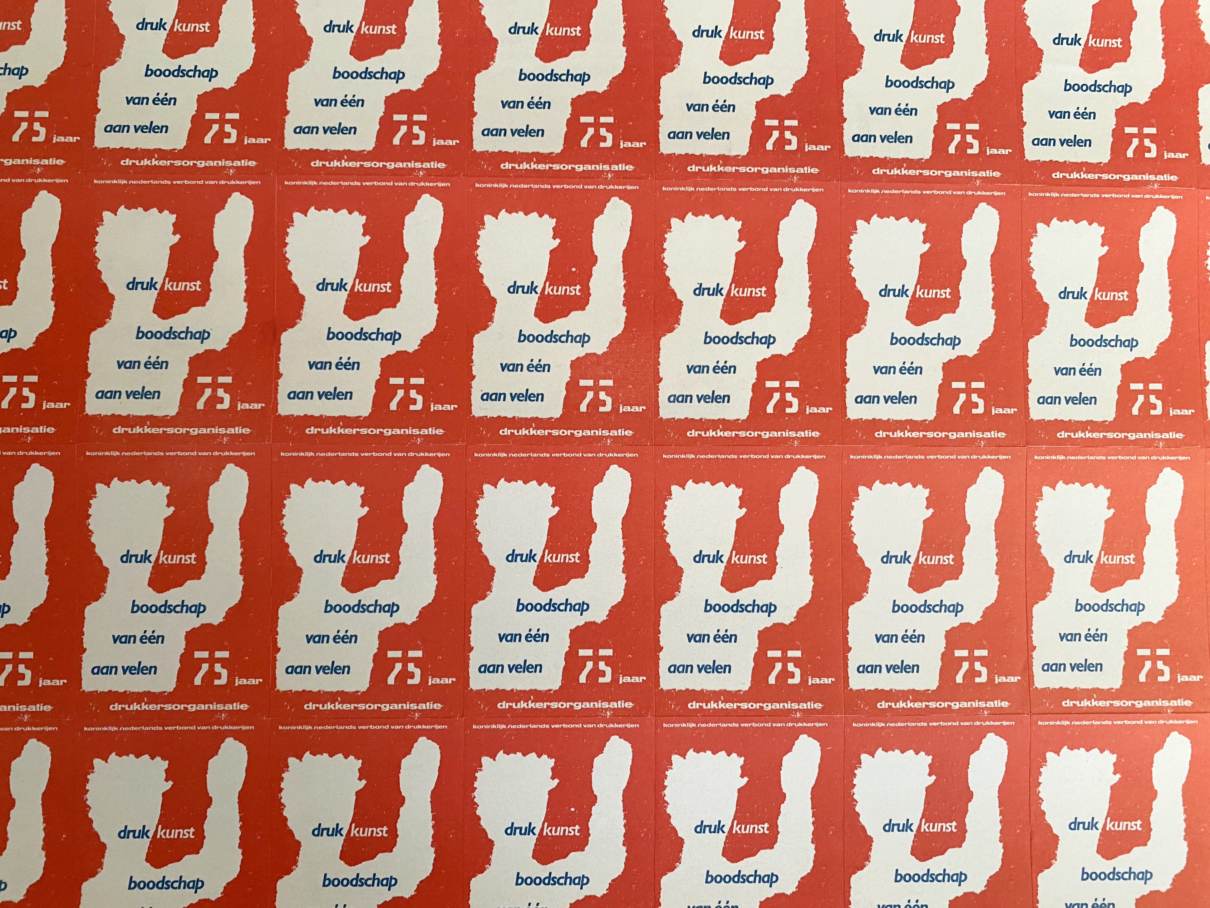 35. SANDBERG, Willem druk kunst boodschap van een aan velen. 75 jaar drukkersorganisaties. (affiche). Koninklijk Nederlands Verbond van Drukkerijen, [1976]. 61 x 43 cm. Gedrukt in rood en blauw naar een scheursel van W. Sandberg. Eén klein randscheurtje, verder gaaf.