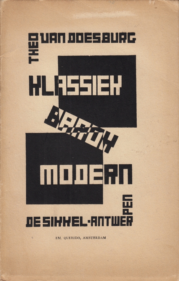 14. DOESBURG, Theo van Klassiek-barok-modern. Lezing. Antwerpen/ Amsterdam, De Sikkel/ Querido, (1920). 22 x 15 cm. Ingenaaid (omslagontwerp Theo van Doesburg). 32 p. + 16 p. illustratiekatern. Niet afgesneden. 1e druk. Omslag deels licht verbruind en bovenaan geschaafd, verder heel gaaf en fris. Met de handtekening van dichter-journalist M.H. Werkman, broer van H.N.