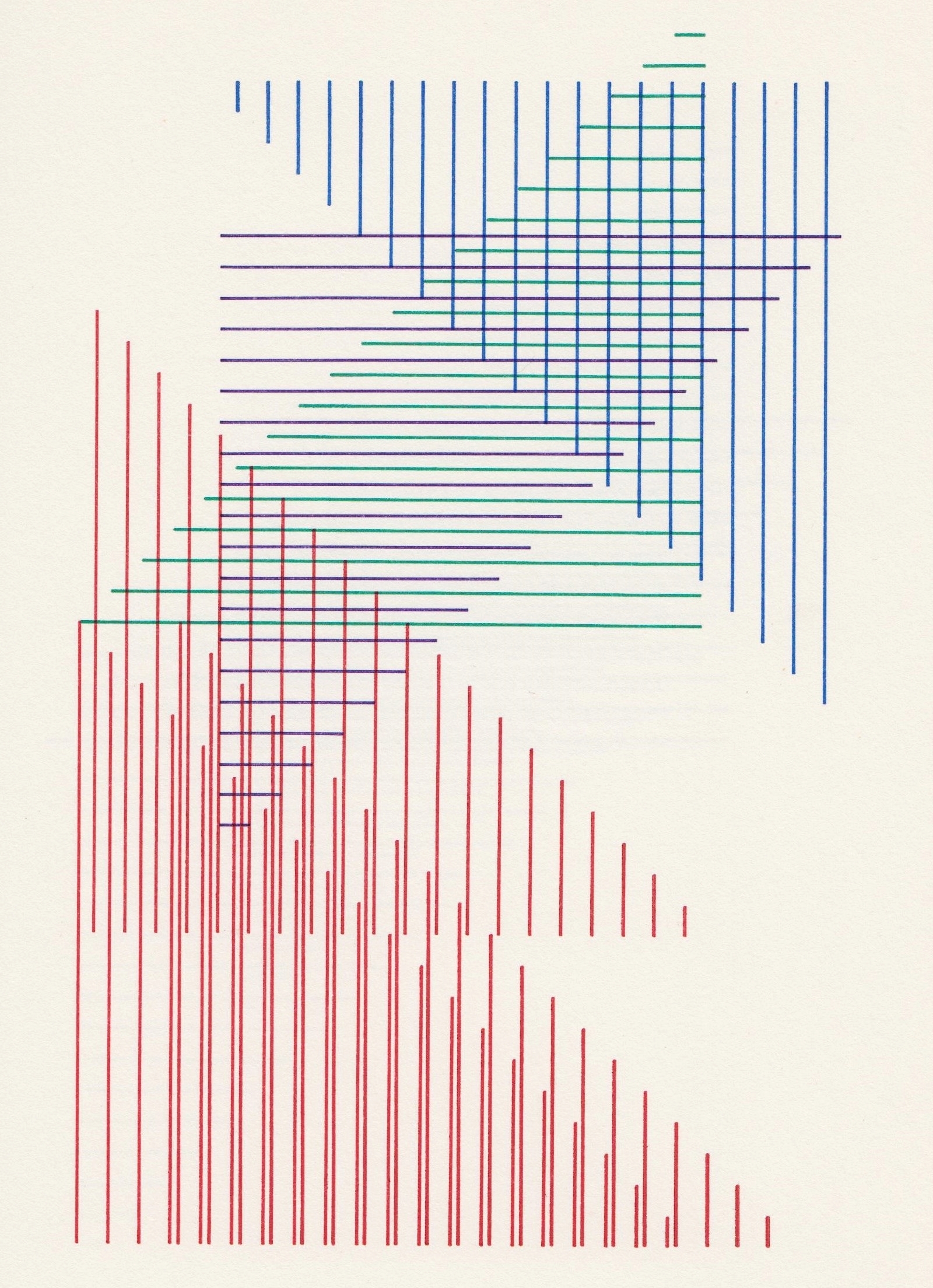 * Abstracte illustraties, die de drukker in het colofon ‘lijntrekkerswerk’ noemt, en die doen denken aan het vrije werk van Piet Zwart. ‘Cornelis Bellaert’ is een pseudoniem van de drukker, Cees van Dijk.