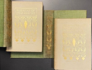 * Buitengewoon fraaie art-nouveau-uitgave in rijkverguld roomwit linnen met speciale stofomslagen, en niet te vergeten het even getinte, geschepte papier dat een feest is voor de vingers. Genummerd nr. 31 van een ongespecificeerde luxe oplage (250?). Per gedicht worden de vertalingen vergeleken van Fitzgerald, Nicolas, McCarthy, Kerney, Whinfield, Garner, Bodenstedt en Schack, maar ook andere vertalingen en Omar Khayyamcommentaren worden besproken.