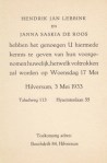 38. ROOS, S.H. de Trouwkaart van Hendrik Jan Lebbink en Janna Saskia de Roos, Hilversum, 3 Mei 1933. 17,5 x 11,5 cm. Kaart van geschept papier. Gezet uit de letter Erasmus (van S.H. de Roos).