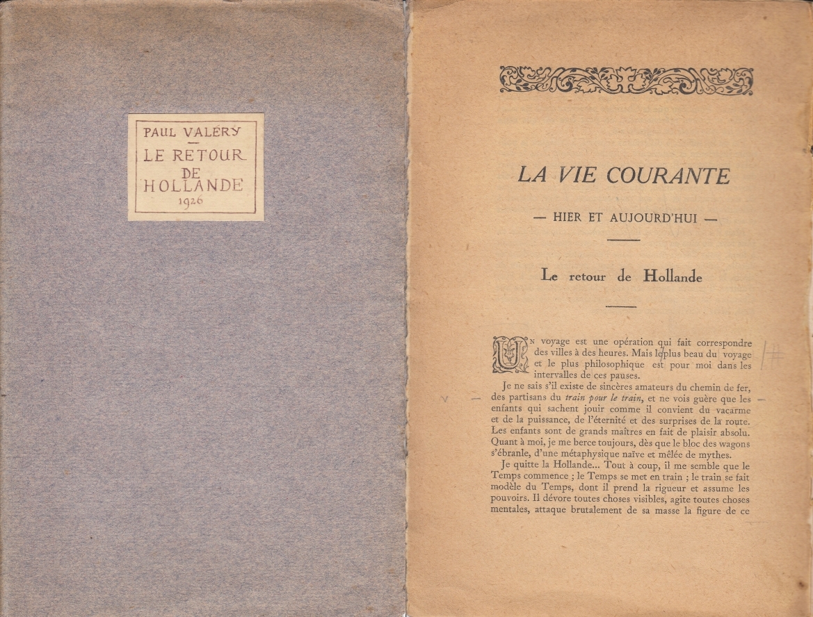 44. (STOLS, A.A.M.). VALÉRY, Paul Le retour de Hollande. (Extrait de “La Revue de France”, 1 Mars 1926, no. 5). Pag. 160-171 van La Revue de France in een vel gevergeerd papier geplakt, en in een paarsgrijs omslag genaaid. Met etiket waarop in paarse inkt schrijver, titel en jaartal 1926 zijn geschreven. Voorin in het handschrift van Stols, in paarse inkt, de herkomst van de tekst.