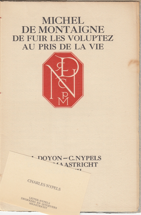 31. (NYPELS). MONTAIGNE, Michel de De fuir les voluptez au pris de la vie. Parijs/ Maastricht, R.L. Doyon/ Nypels, 1927. Cahiersteek met rood garen. (8) p. Gezet uit letters ‘dits Plantin’ (een grote, zware letter) plus een stukje Grieks, en gedrukt in rood en zwart op Ossekop in een oplage van 150 exemplaren. Roestvlekje in enkele pagina’s (o.a. titel), omslag deels vergeeld. Nummer uitgegumd en ook een deel van de handtekening.
