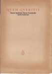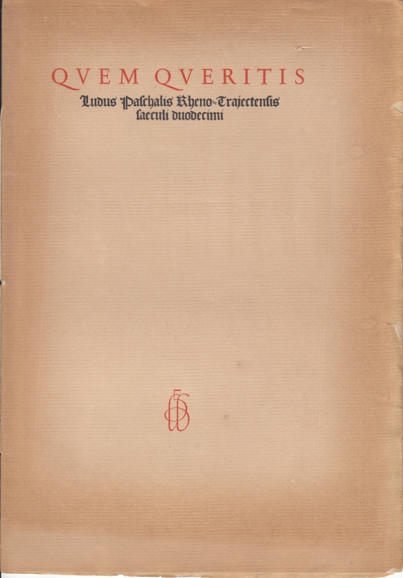 * Een geheel in het Latijn gestelde uitgave van de Vijf Ponden Pers: ‘Wie zoekt u, o volgelingen van Christus?/ Jezus van Nazareth, de gekruisigde, o hemelbewoner!/ Hij is niet hier, Hij is verrezen, zoals voorzegd was. Ga nu heen en verkondigt dat Hij is verrezen, dat de Heer is verrezen uit het graf!/ Looft de Heer.’ Tekst van een religieus spel uit de vroege middeleeuwen, verzorgd door Jan van Krimpen voor de vrienden van de Vijf Ponden Pers (‘ad usum amicorum v.lb.’), in 50 exemplaren op Hollands papier (‘charta Batava’). Een bijzonder kwetsbare uitgave, wellicht daarom ook zeldzamer dan de andere Vijf Ponden-uitgaven. De Jong 683.