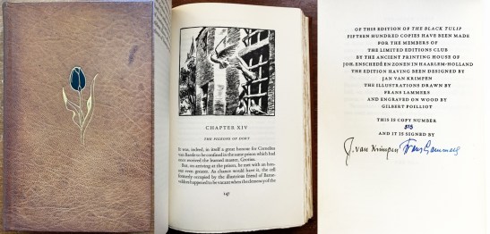 * Een wild avontuur, deze Engelstalige, maar zeer Nederlandse boekproductie van de Limited Editions Club, verzorgd door Jan van Krimpen, in ruig naturel leer gebonden, de schepranden van het papier ruw, met beweeglijke, expressieve illustraties. De zwarte tulp (1850) van Alexandre Dumas père (1802-1870) is een spannende roman vol actie, die speelt in Den Haag en Haarlem na de moord op de gebroeders De Witt – in een merkwaardig Holland gezien door een Franse groteschrijversbril. Leuk om te lezen hoe Dumas het zeventiende-eeuwse Nederland vervormt en herkleit tot een geschikt decor voor zijn avontuurlijke romance.