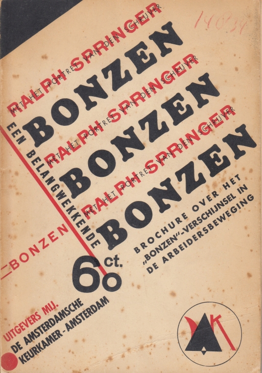 43. SPRINGER, Ralph “Bonzen” (Brochure over het “bonzen”-verschijnsel in de arbeidersbeweging). Amsterdam, Amsterdamsche Keurkamer, [1933]. Ingenaaid. 80 p. Met portret van de auteur. 1e druk. Op het omslag roestspikkels en op de achterkant vage notities (‘Technische dienst Hervormde Kerk/ Leiden’). Wat roest en vergeling. Voorin notities in rood potlood.
