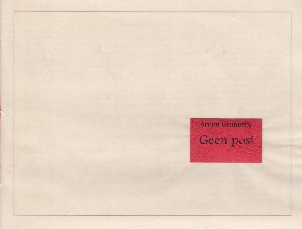 26. GRUNBERG, Arnon Geen post. Eindhoven, Antiquariaat En Passant, 1997. Cahiersteek met transparant omslag. Oblong. (4) p. [Typografie Jos Wuijts]. Gedrukt in een oplage van 50 genummerde exemplaren. 1e druk.