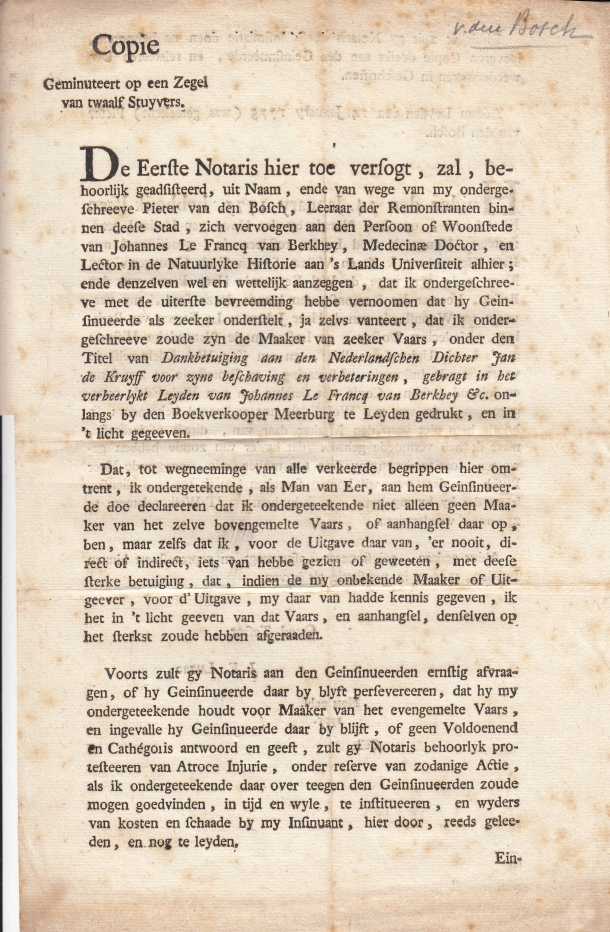 * Notariële eis van de Leidse predikant Pieter van den Bosch aan Joannes Le Francq van Berkhey tot herroeping van diens toeschrijving aan hem van de kritische Dank-betuiging aan den Nederlandschen dichter Jan de Kruyff voor zijne beschaving en verbeteringen, gebragt in het verheerlijkt Leyden van Johannes Le Francq van Berkhey &c. onlangs bij den Boekverkooper Meerburg te Leyden gedrukt, en in ’t licht gegeeven.’ ‘Copie geminuteert op een Zegel van twaalf Stuyvers’. Van den Bosch vatte de toeschrijving van het auteurschap op als een ‘Atroce Injurie’.