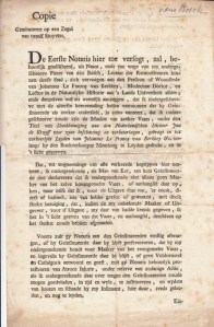 24. (FRANCQ VAN BERKHEY, Joannes LE). BOSCH, Pieter van den De Eerste Notaris hier toe versogt, zal, behoorlijk geadsisteerd, uit Naam, ende van wege van my ondergeschreeve Pieter van den Bosch, Leeraar der Remonstranten binnen deese Stad, zich vervoegen aan den Persoon of Woonstede van Johannes Le Francq van Berkhey, Medecinae Doctor (…). Leiden, eigen beheer, 1775. Een blad, tweezijdig bedrukt. In druk gesigneerd door Isaac Etienne Luzac, ‘openbaar Notaris bij den Hove van Holland’. Gevouwen en iets ingescheurd. Roestig en met kreukjes.