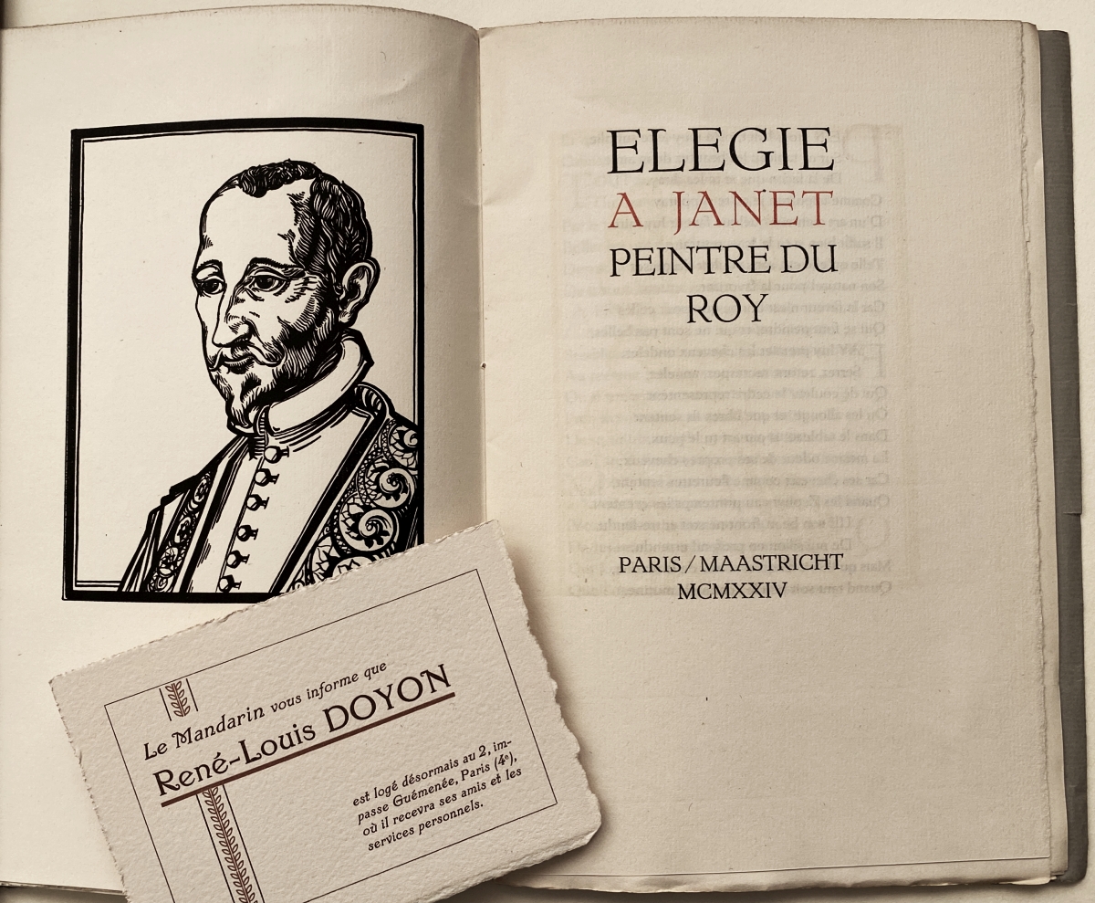 32. (NYPELS). RONSARD, Pierre de Elegie a Janet Peintre du Roy. (Met een portret van de dichter door W.J. Rozendaal). Parijs, René-Louis Doyon/ Maastricht, Charles Nypels, 1924. Genaaid. 24 p. Gezet uit de Erasmus van S.H. de Roos plus initialen eveneens van De Roos en gedrukt in rood, grijs en zwart op papier van H. de Charro in een oplage van 150 exemplaren, die alle buiten de handel bleven. Omslag wat verkleurd en aan de randen versleten. Onderaan het ruggetje ingescheurd. Met inliggend tweekleurig gedrukt kaartje: ‘Le Mandarin vous informe que René-Louis Doyon est logé désormais’ (= mooi verhuisbericht).
