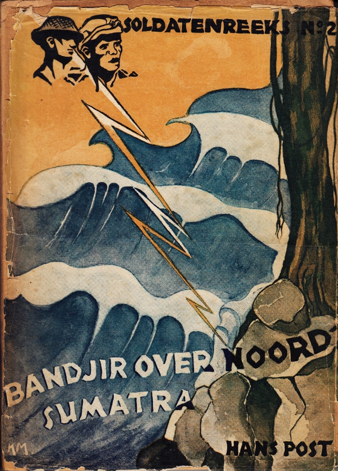 35. POST, Hans Bandjir over Noord-Sumatra. Boek I van de gelijknamige trilogie. Medan, Uitgeverij “Pax”, (1948). Ingenaaid met stofomslag. 144 p. Met een voorwoord door de Territoriaal tevens Troepencommandant Noord-Sumatra generaal-majoor P. Scholten, gevolgd door een ingeplakt portret van Scholten. 1e druk. Van het stofomslag is alleen de geïllustreerde voorkant bewaard gebleven.