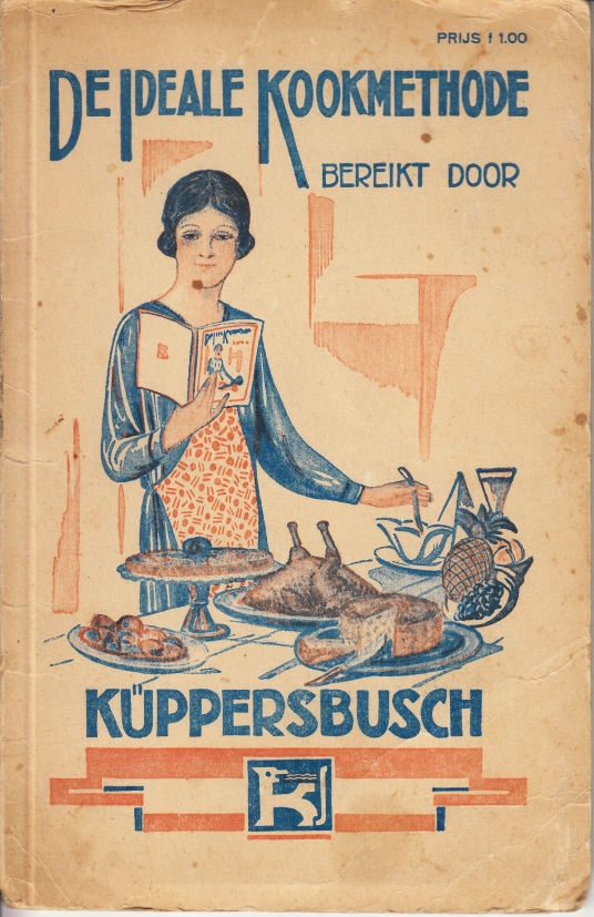 * Aansprekend kookboek met kleurige voorplaat, alle pagina’s met gastronomisch kader. Veel recepten, maar ook: wat is steriliseren, inmaken, grillen en braden. Deze 1e druk niet in Witteveen-Cuperus. Datering gevonden dankzij Delpher.