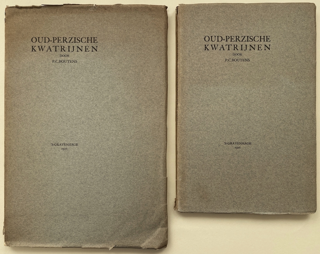 2. BOUTENS, P.C. Oud-Perzische kwatrijnen. (Geletterd exemplaar op groot papier). Den Haag, (A.A.M. Stols), 1926. 27 x 18 cm. Ingenaaid in omslag. (6), CVIII p. Gezet uit de Garamond en gedrukt door Boosten & Stols in rood en zwart in een oplage van 125 genummerde exemplaren. Met een portrethoutsnede van J. Franken Pzn. 1e druk. Rugje versleten, vooromslag bijna los, achterzijde omslag los.