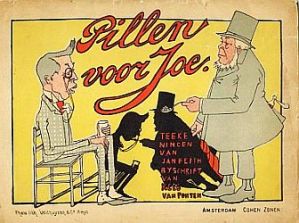 * Een prachtig, maar kwetsbaar prentenboek van de begaafde karikaturist Jan Feith (pseudoniem: Chris Kras), gericht tegen de Engelsen tijdens de Boerenoorlog. De rijmpjes van Van Ponten werden door de kunstenaar uitgeschreven. Op de voorkant overhandigt Paul Kruger een lepel pillen aan de Britse minister van Koloniën, Joseph Chamberlain (‘Joe’), terwijl achterop een man op een ezel met een monocle staat afgebeeld, die sterk doet denken aan Winston Churchill.