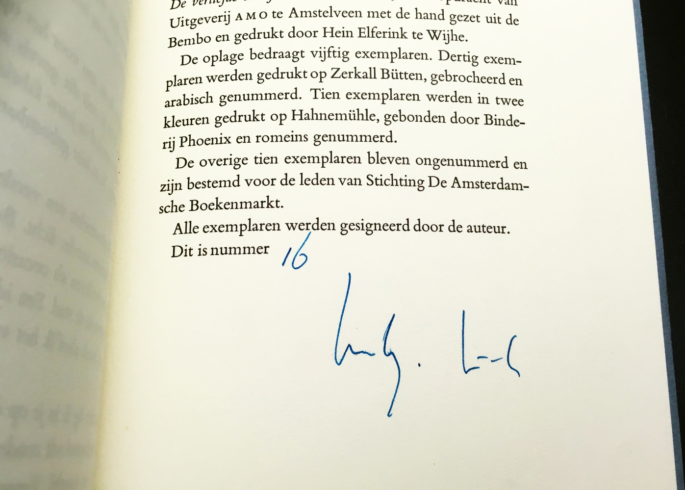 * Gesigneerd door de auteur op de titelpagina, verticaal naast het exlibris dat daar is ingeplakt.