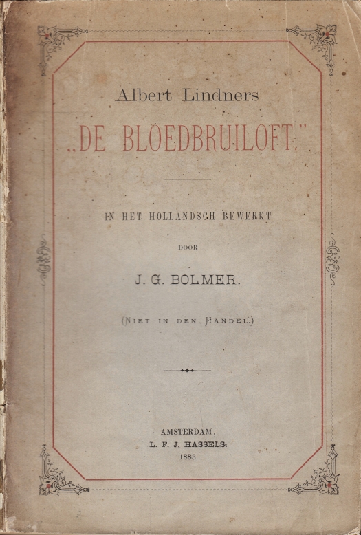 10. (BOSBOOM-TOUSSAINT, A.L.G.) Albert Lindners “De bloedbruiloft” in het Hollandsch bewerkt door J.G. Bolmer. (Niet in den Handel). Amsterdam, L.F.J. Hassels, 1883. Origineel omslag. XII, 164 p. 1e druk. Rug en omslag aan de randen versleten, achterzijde omslag los.