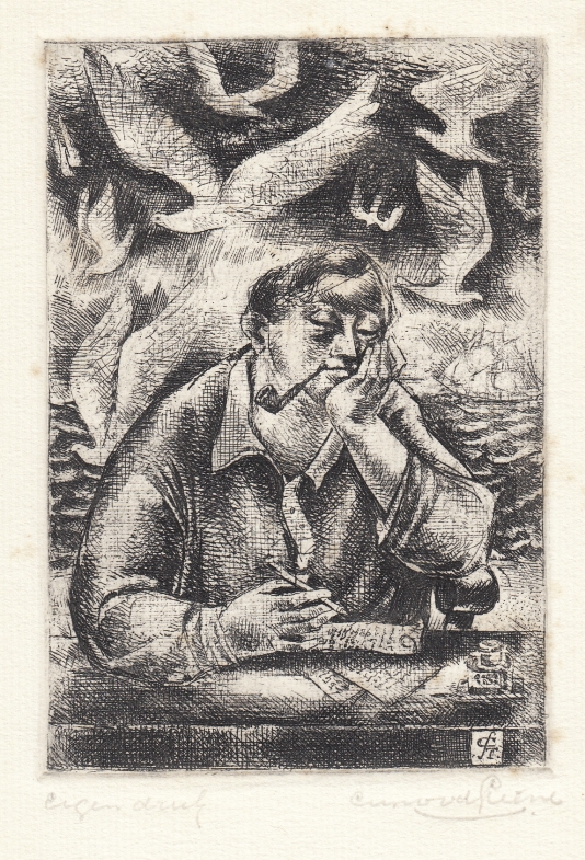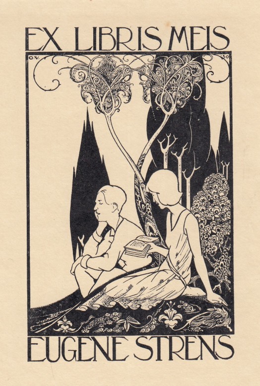 37. KUYLE, Albert Seinen. (Gesigneerd op Boekendag 1930). Utrecht/Nijmegen, Dekker & Van de Vegt/Van Leeuwen, 1924. Ingenaaid met stofomslag. (2), 58 p. Met vijf originele houtsneden (+ één op het omslag) van Joep Nicolas. Gedrukt door A.A.M. Stols in rood, blauw en zwart op Engels vergé-papier in 360 genummerde exemplaren. Debuut. 1e druk. Met schitterend exlibris van Eugène Strens, ontworpen door Otto Verhagen in 1930, waarop een meisje uit een boek aan een jongen voorleest, gezeten in een geheimzinnige tuin. Omslag met roestvlekjes en iets verkleurd.
