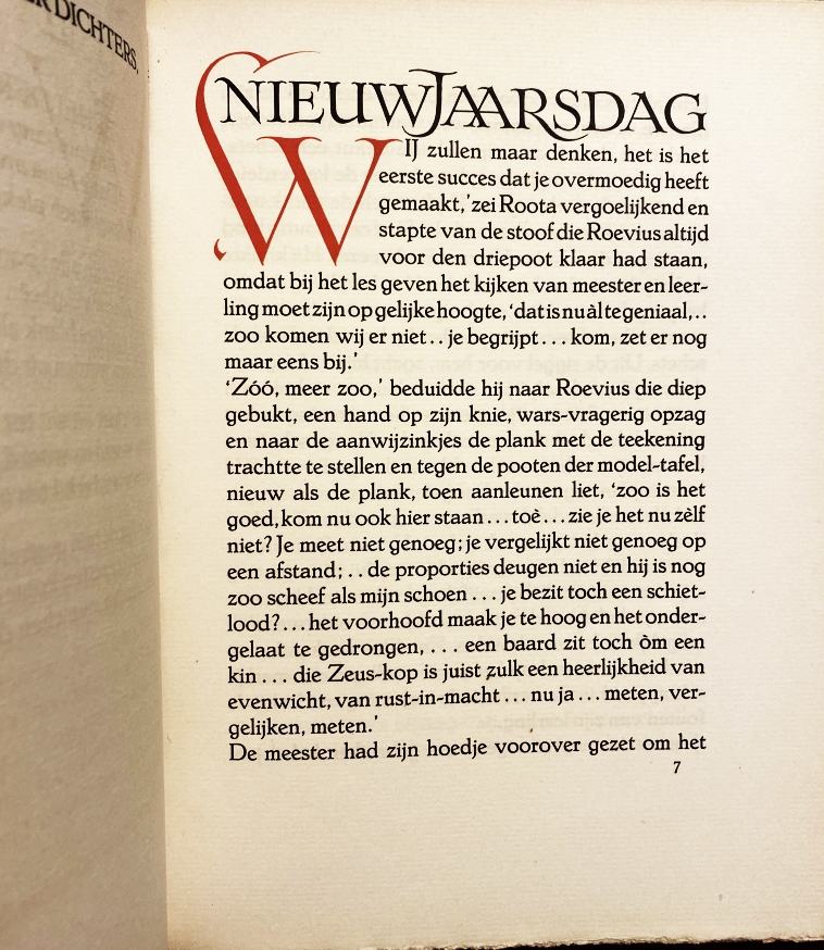 40. LOOY, Jac. van Nieuwjaarsdag. [Den Haag], Vereeniging Joan Blaeu, 1919. Halfperkament. 4to. (6), 110 p. Gedrukt in rood en zwart door Mouton met letters en initialen van S.H. de ROOS in een oplage van 200 exemplaren. Roestvlekjes op de platten.