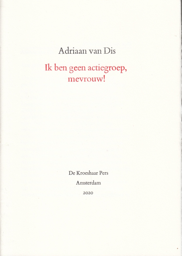 30. DIS, Adriaan van Ik ben geen actiegroep, mevrouw! Amsterdam, De Kroeshaar Pers, 2020. Cahiersteek. 8 p. Brief waarvan de tekst gevonden is ‘tussen de papieren van een oude kennis’. Gedrukt in rood en zwart op een handpers voor een beperkte groep liefhebbers. 1e druk.