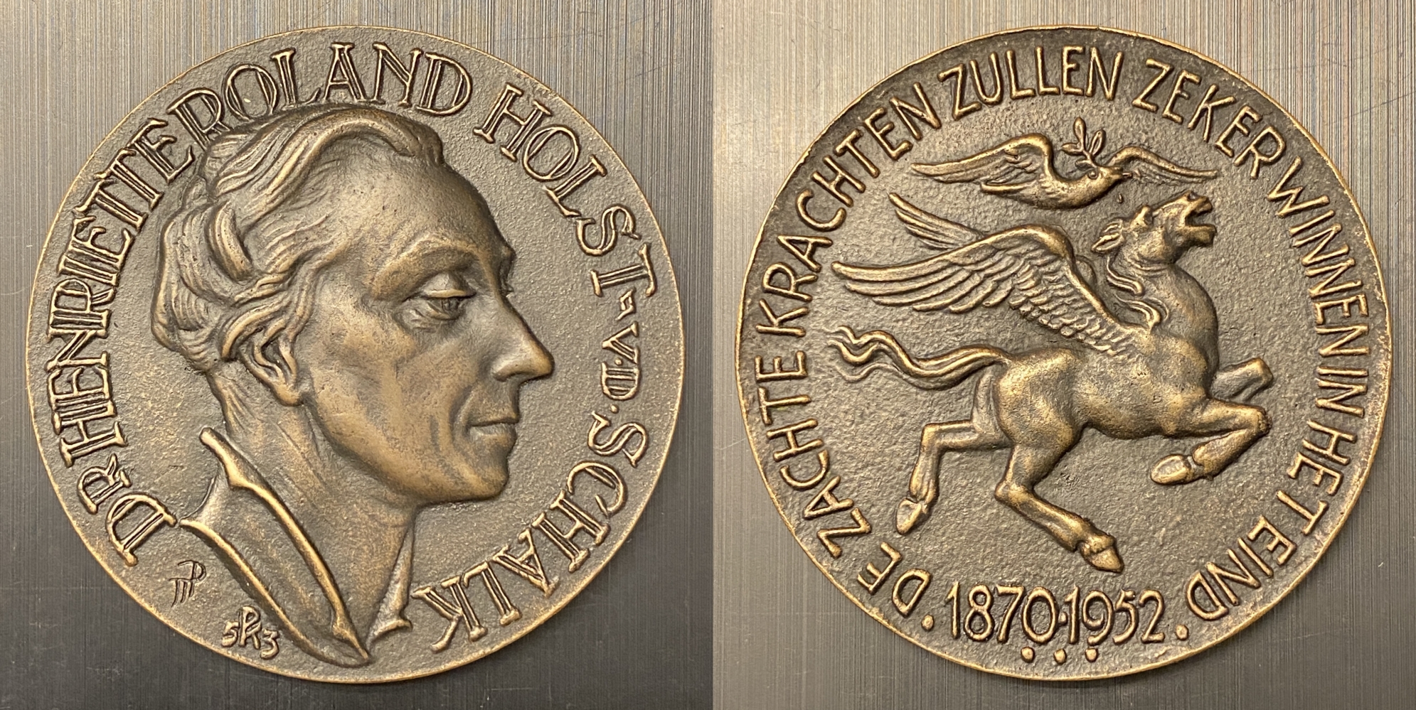 43. ROLAND HOLST, Henriëtte Henriette Roland Holst-van der Schalk. Jaarpenning 1953 van de Vereniging voor Penningkunst. Voorzijde: Portret naar rechts. Keerzijde: Pegasus onder een vredesduif, daaromheen de tekst ‘De zachte krachten zullen zeker winnen in het eind’. Diameter 76 mm. 125 gram. Zeer fraai-prachtig.