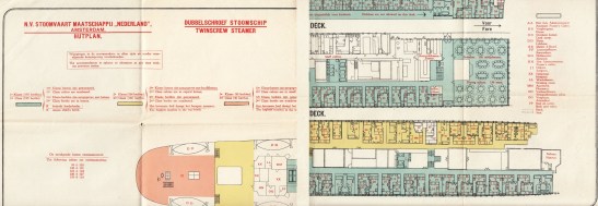46. SCHEEPSPLATTEGROND Hutplan/ Cabinplan Dubbelschroef Stoomschip/ Twinscrew Steamer “Jan Pieterszoon Coen”. Bruto register tons 11.140. Amsterdam, Stoomvaart Maatschappij “Nederland”, (1936). 75 x 53 cm. Uitvouwblad bedrukt in rood, zwart, blauw, geel en lichtrood. 5 dekken met toelichting. Vouwscheurtje. Teer, maar in goede staat.