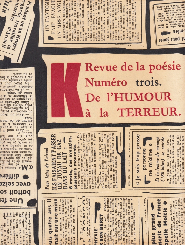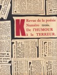 * Het derde en laatste nummer van dit absurdistische tijdschrift, dat lukraak bij elkaar gegooide bijdragen aan elkaar lijkt te hebben geplakt. Met teksten van o.a. Kurt Schwitters, Lewis Carroll, Christopher Smart, Francis Picabia, Bertolt Brecht, James Thurber, Hans Arp, Franz Kafka en afbeeldingen van o.a. Paul Klee, Maurice Henry, André Frédérique en Henri Michaux.