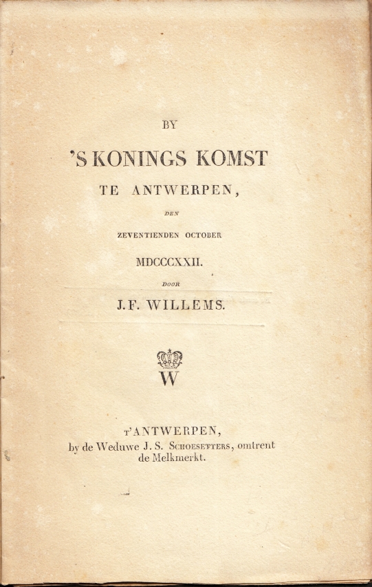 54. WILLEMS, J.F. Bij ’s Konings komst te Antwerpen, den zeventienden october MDCCCXXII Antwerpen, Weduwe J.S. Schoesetters, 1822. Genaaid in oranje omslag met later etiket (deels weer verwijderd). 1e druk. Verder gaaf met inliggend artikel over Willems uit 1943.