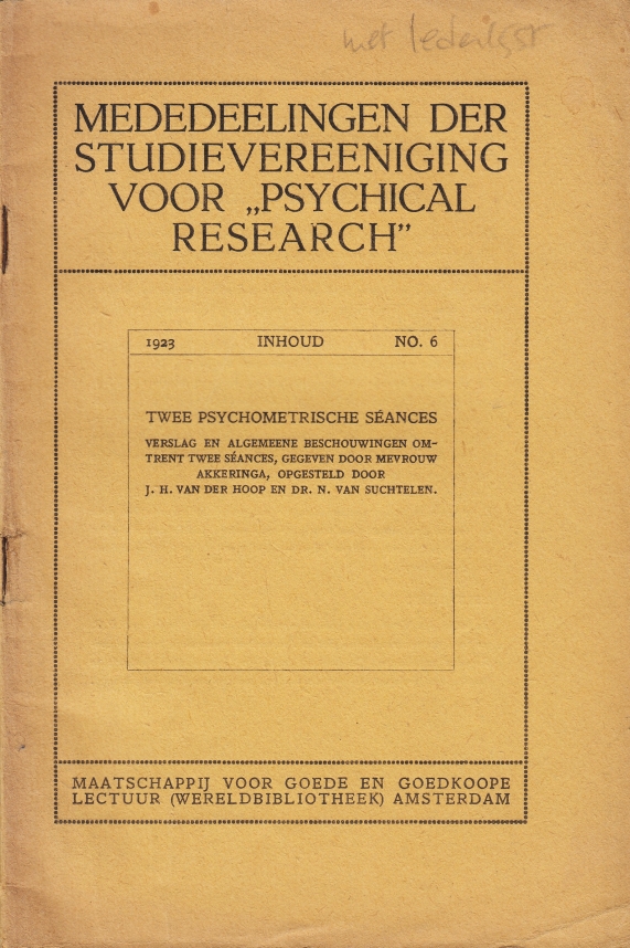 * Met het uitvoerige artikel ‘Twee psychometrische séances’ van J.H. van der Hoop (psychiater) en Nico van Suchtelen (directeur van de Wereldbibliotheek). En, zeer nuttig voor historisch onderzoek, een ledenlijst (mét adressen).