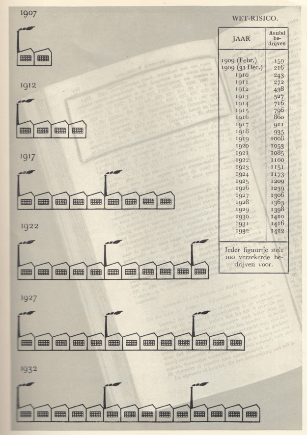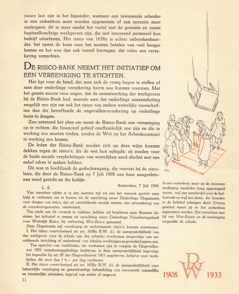 39. (LEESER, Titus). WET-RISICO Vereeniging tot het onderling dragen van wettelijk risico. 28 December 1908-1933. Amsterdam, Wet-Risico, 1933. 27 x 20 cm. Ingenaaid. 50 p. Gedrukt in rood en zwart. Met veel kleine tekeningen van Titus Leeser. Ook met foto’s en tabellen, en met twee schitterende beeldstatistieken. 1e druk. Helaas is het omslag vlekkig en versleten, maar het binnenwerk is in behoorlijke staat.