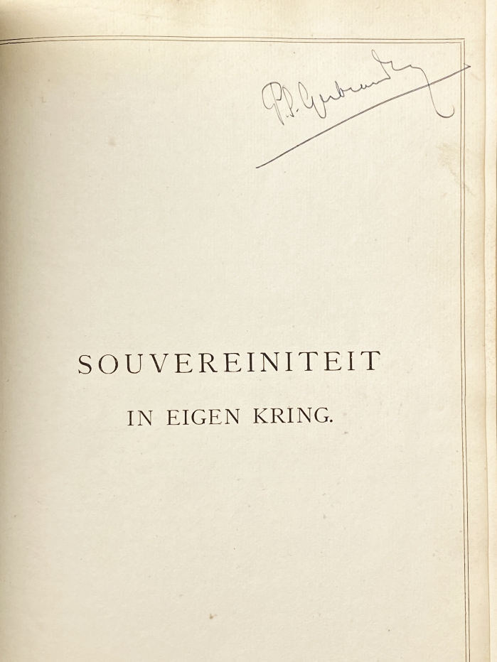 3. Souvereiniteit in eigen kring, rede ter inwijding van de Vrije Universiteit, den 20sten October gehouden, in het Koor der Nieuw Kerk te Amsterdam. Amsterdam, J.H. Kruyt, 1880. 44 p. Gedrukt op geschept papier, alle pagina’s met gedrukt kader. Omslag meegebonden. Met de handtekening van P.S. Gerbrandy. Op p. 36-38 enkele redactionele aanstrepingen in rood, mogelijk schrapping van passages voor een nieuwe druk.