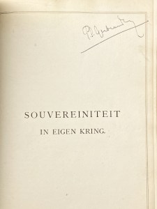 38. KUYPER, Abraham Verflauwing der grenzen. – Evolutie. – Souvereiniteit in eigen kring. (Drie vroege publicaties, in één band gebonden met de handtekening van Pieter Sjoerds Gerbrandy). Halflinnen band met gemarmerde platten. 27 x 21 cm. Alle drie delen in kwartovorm. De band is mooi, de drie geschriften hebben grotere en kleinere gebruikssporen: van slijtage tot kreukjes.