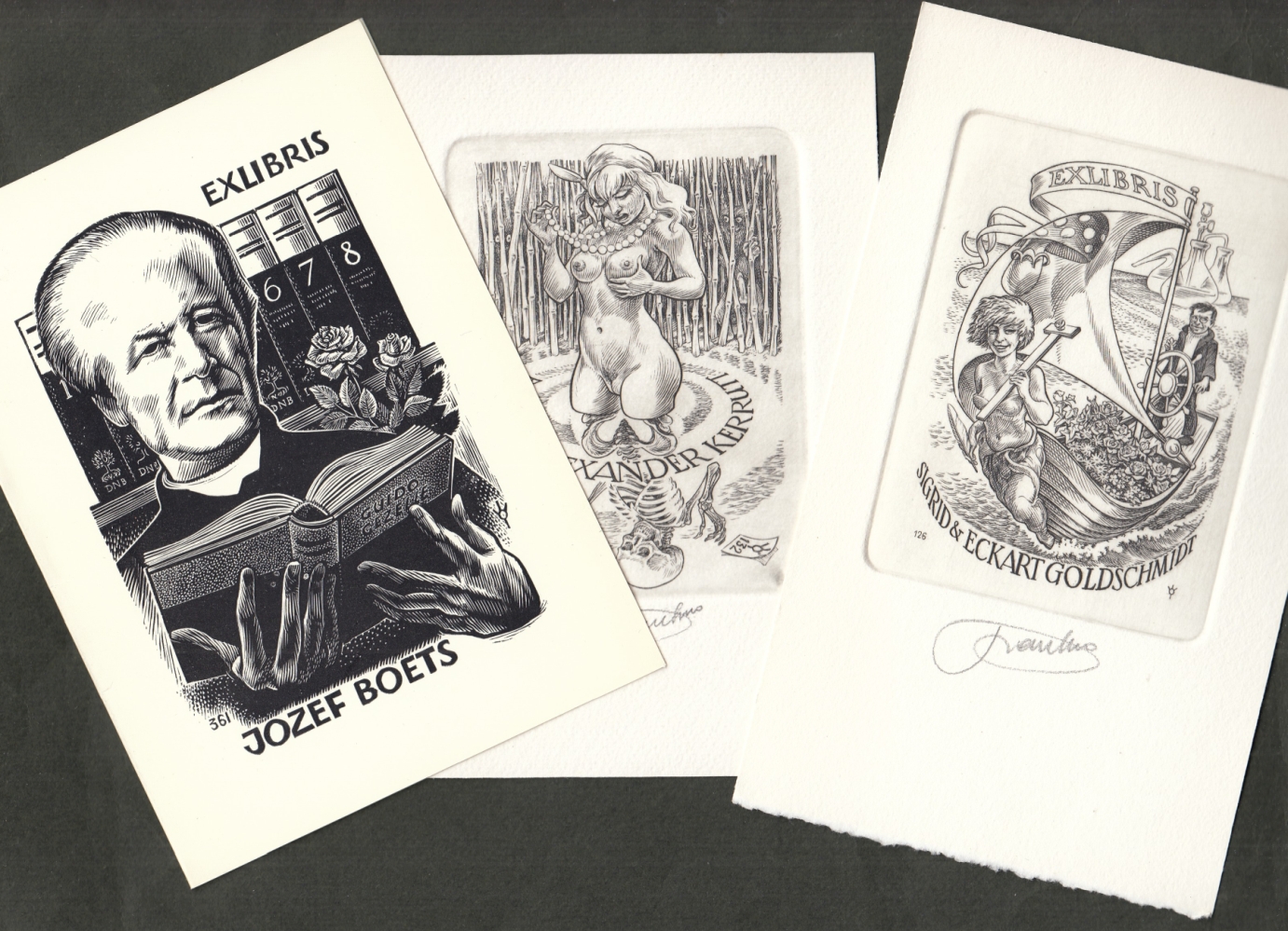 29. DAMME, Frank-Ivo van Twaalf exlibris. Uitgevoerd in boekdruk en kopergravure, zwartwit, acht van de 12 in potlood gesigneerd, negen zijn erotisch van aard. Twee zijn er voor Van Damme’s echtgenote, de kalligrafe Joke van den Brandt. Grootste bladformaat 18 x 12,5 cm. Alle in zeer fraaie staat.