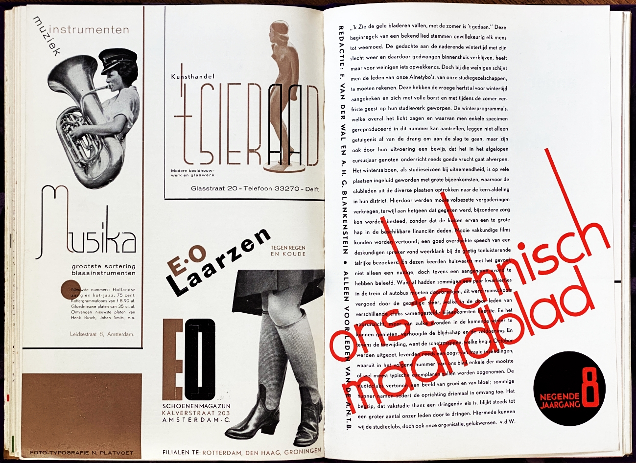 4. (BLANKENSTEIN, A.H.G., & F. van der WAL (red.) Ons technisch tijdschrift. 9e en 10e jaargang. (2 delen). [Amsterdam], Algemene Nederlandse Typografen Bond, 1933-1936. Paars halflinnen met platten van sierpapier. 144; 160 p. Rijk voorzien van illustraties en moderne typografische ontwerpen, o.a. van Nan Platvoet. Omslagen meegebonden. Goede staat.