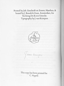 * Dit exemplaar is niet genummerd, maar op naam gedrukt van Charles Nypels, die met Van Krimpen en De Roos de Grote Drie van de Nederlandse typografie van het interbellum vormde. Bovendien was Nypels éen van de drie oprichters van Stichting De Roos. Eén van de allermooiste uitgaven van Stichting De Roos (en éen van de mooiste Nederlandse boeken van de twintigste eeuw). Tekst naar de editie van de Psalmen uit 1611. Leeflang 6.