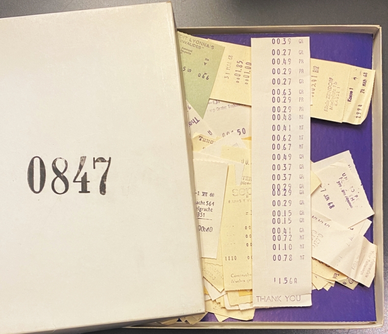 6. BRATTINGA, Pieter Cijfer. (Kwadraatblad 31). (Hilversum, Steendrukkerij De Jong), 1971. 25 x 25 cm. Doos met daarin een twintigtal kassabonnen, die een idee moeten geven van een imaginaire reis. 1e druk. Buitenop genummerd ‘847’.