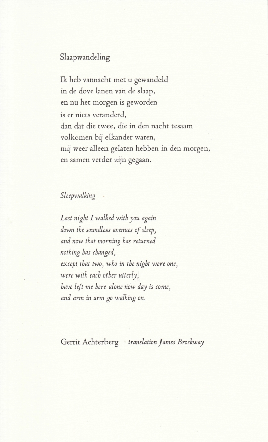 4. (ACHTERBERG, Gerrit) BROCKWAY, James On not translating Achterberg. [Woubrugge], (Avalon Pers, 1993). Cahiersteek. (8) p. en een los bijgevoegd vel met een gedicht van Achterberg met de Engelse vertaling van Brockway. Gezet uit de Centaur en met de hand gedrukt in bruin en zwart in een oplage van 50 exemplaren. 1e druk.