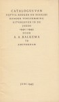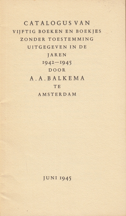 9. BALKEMA, A.A. Catalogus van vijftig boeken en boekjes zonder toestemming uitgegeven in de jaren 1942-1945 door A.A. Balkema te Amsterdam. Amsterdam, A.A. Balkema, June 1945. 19 x 11 cm. Cahiersteek. 16 p. zonder omslag, zoals uitgegeven. Gedrukt op Ossekop-papier. 1e druk. Papier deels verbruind.