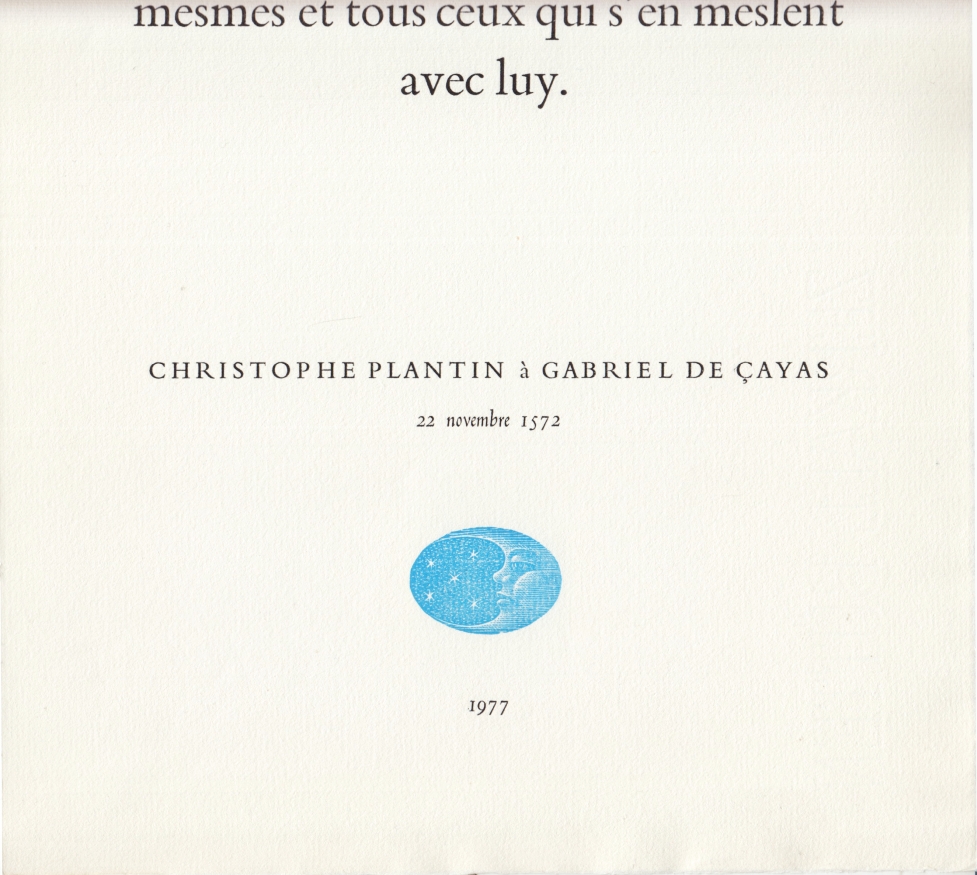 * Excerpt in renaissancefrans uit een brief d.d. 22 november 1572 van Christoffel Plantijn aan Gabriel de Çayas. Met de hand gezet uit een mooi groot lettertype en gedrukt in blauw en zwart.