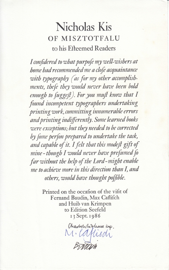 * Gesigneerd door Charles Whitehouse, de drukker van Edition Seefeld, door de typograaf Caflisch en de kalligraaf-typograaf Baudin. Miklós Kis (=Nicolaas Klein) was een 17e-eeuwse Hongaarse lettersnijder en drukker, die van 1680-1689 het vak leerde in Nederland. Niet in Worldcat.