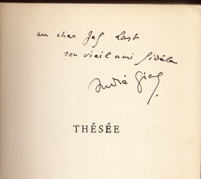 21. GIDE, André Thésée. New York, Pantheon, 1946. Linnen met stofomslag. 128 p. Omslag iets verbruind en aan de randen versleten.