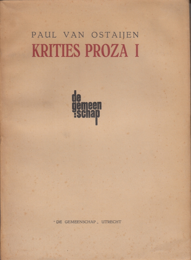 32. OSTAIJEN, Paul van Krities proza I (en) II. Utrecht, De Gemeenschap (deel I) en Antwerpen/ Utrecht, De Sikkel/ De Gemeenschap (deel II), [1929]. Twee delen. Ingenaaid. 160; 164 p. Gedrukt in een oplage van 525 genummerde exemplaren. 1e druk. Ruggen licht verbruind, paar roestvlekjes op omslag deel I, kop deel II vuil. Gave en mooie set.