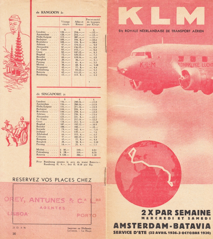 * Mooie folder met voorop een vliegtuig en een kaartje. Om een idee te geven, een enkeltje Amsterdam-Bandoeng per vliegtuig kostte 1355 gulden, omgerekend met correctie voor 1936 is dat maar liefst 18.500 euro (CBS).