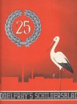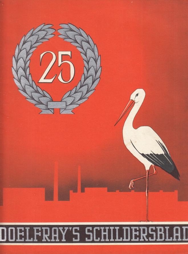 17. DOEL & FRAY, Van den Doelfray’s Schildersblad. Jaargang 12 in 12 nummers. Den Haag, Van den Doel & Fray Verf- en Vernisfabrieken, 1938. 29 x 22 cm. Uniform omslag in oranje, zilver en wit met voorop de Haagse ooievaar, een fabrieksprofiel en een krans met ’25’ en achterop twee geharnaste ridders, eveneens met ooievaars getooid. Per nummer 24 p. Geïllustreerd in zwartwit. 1e druk. Hier en daar een vlekje of kreukje, maar in zeer goede staat.
