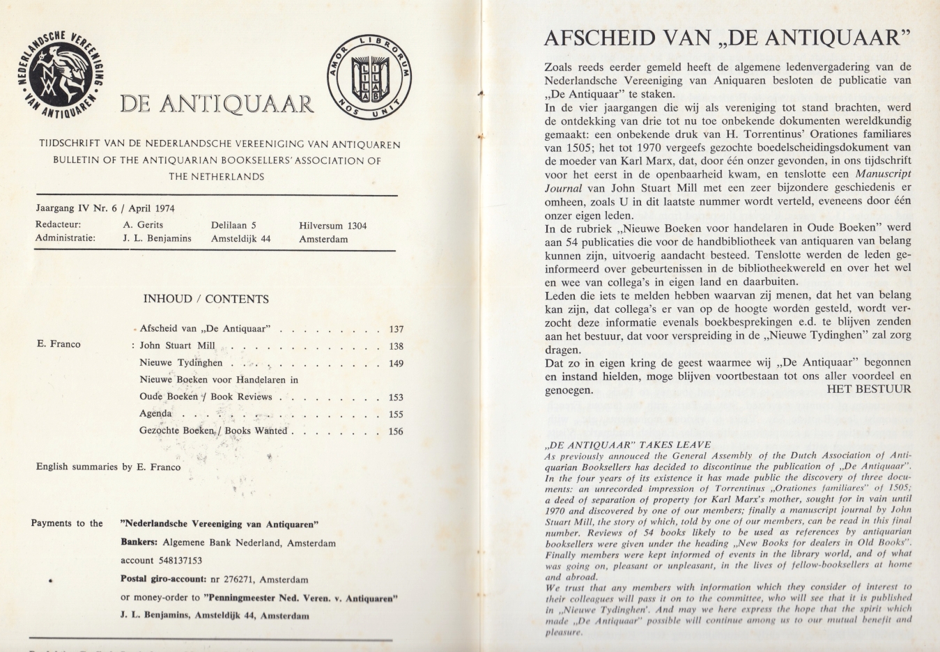 6. ANTIQUAAR, De Tijdschrift van de Nederlandsche Vereeniging van Antiquaren. Bulletin of the Antiquarian Bookseller’s Association of the Netherlands. 1969-1974. Jaargang 1 t/m 4 (jrg. 1, afl. 3 en 6 ontbreken). 22 (van 24) afleveringen. Alles wat verscheen, op twee nummers na compleet. Enkele nummers met wat waterschade.