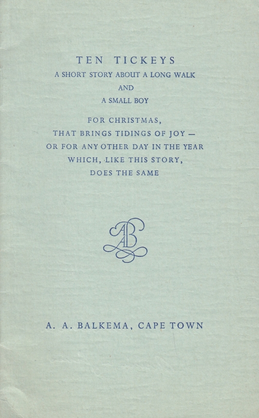 * Met handgeschreven gelukwens van ‘Annie en Guus’ [Balkema]. Kerstgeschenk van uitgeverij Balkema, met een lief verhaaltje over een ‘undersized Coloured boy’, een krantenverkoper en zijn zieke hondje Blackie. August A. Balkema (1906-1996) was boekhandelaar in Amsterdam, maar verhuisde in 1946 naar Zuid-Afrika, waar hij een belangrijke uitgeverij stichtte. Cosmo Diodoni de Bosdari (1901-1979) was een Zuid-Afrikaans schrijver van Ragusaans-Albanese afkomst. Een ‘tickey’ is een threepence.
